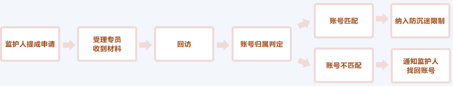 在监护人发现被监护人有沉溺厦门佳阅娱乐平台的情况下,监护人可向游家公司申请发起未成年人家长监护机制。 监护人需亲自通过邮寄方式 向我司提供有效材料,向游家公司提出未成年人账户监控的申请。在收到邮件后,我司即开始启动监护机制审核流程,首先进入疑似账号身份确认期。